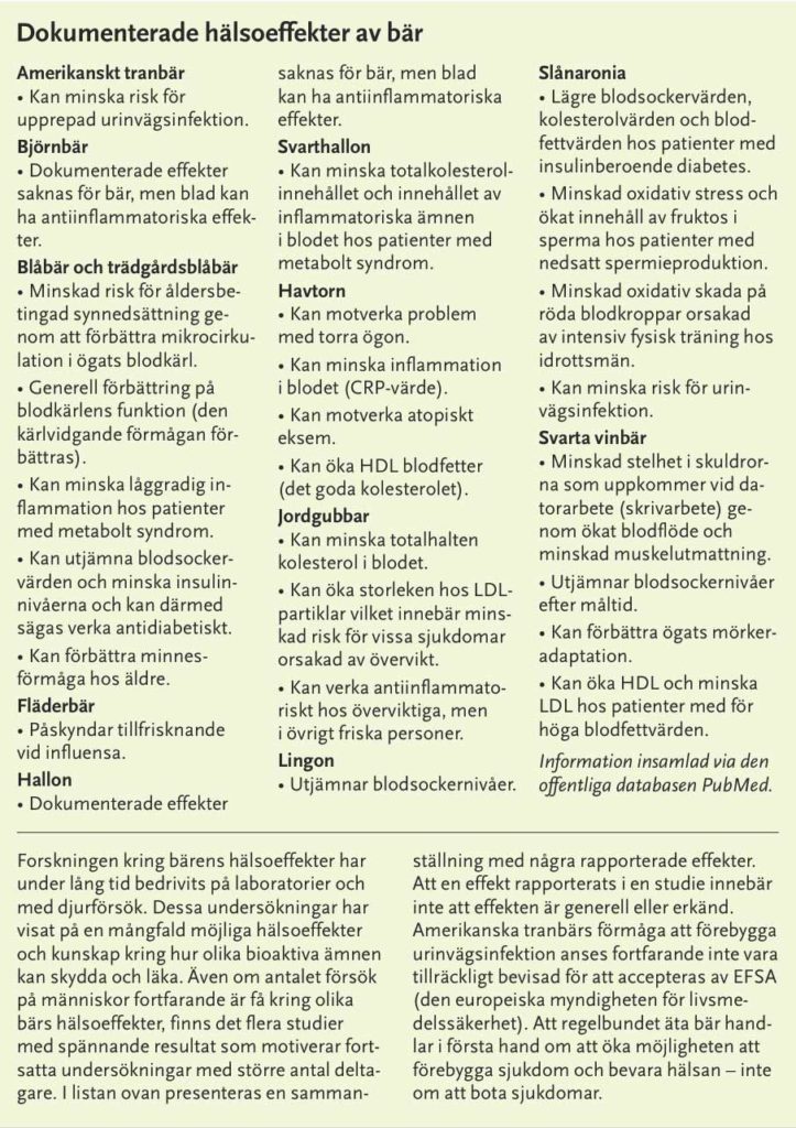 Intresset för bär och stödet för deras positiva hälsoeffekter har förmodligen aldrig varit större än vad det är i dag. Under de senaste 20 åren har man forskat intensivt kring bärens innehåll av olika bioaktiva ämnen (ämnen med potentiellt hälsofrämjande egenskaper). Allt fler studier med både djur och människor har visat på en rad intressanta effekter.
